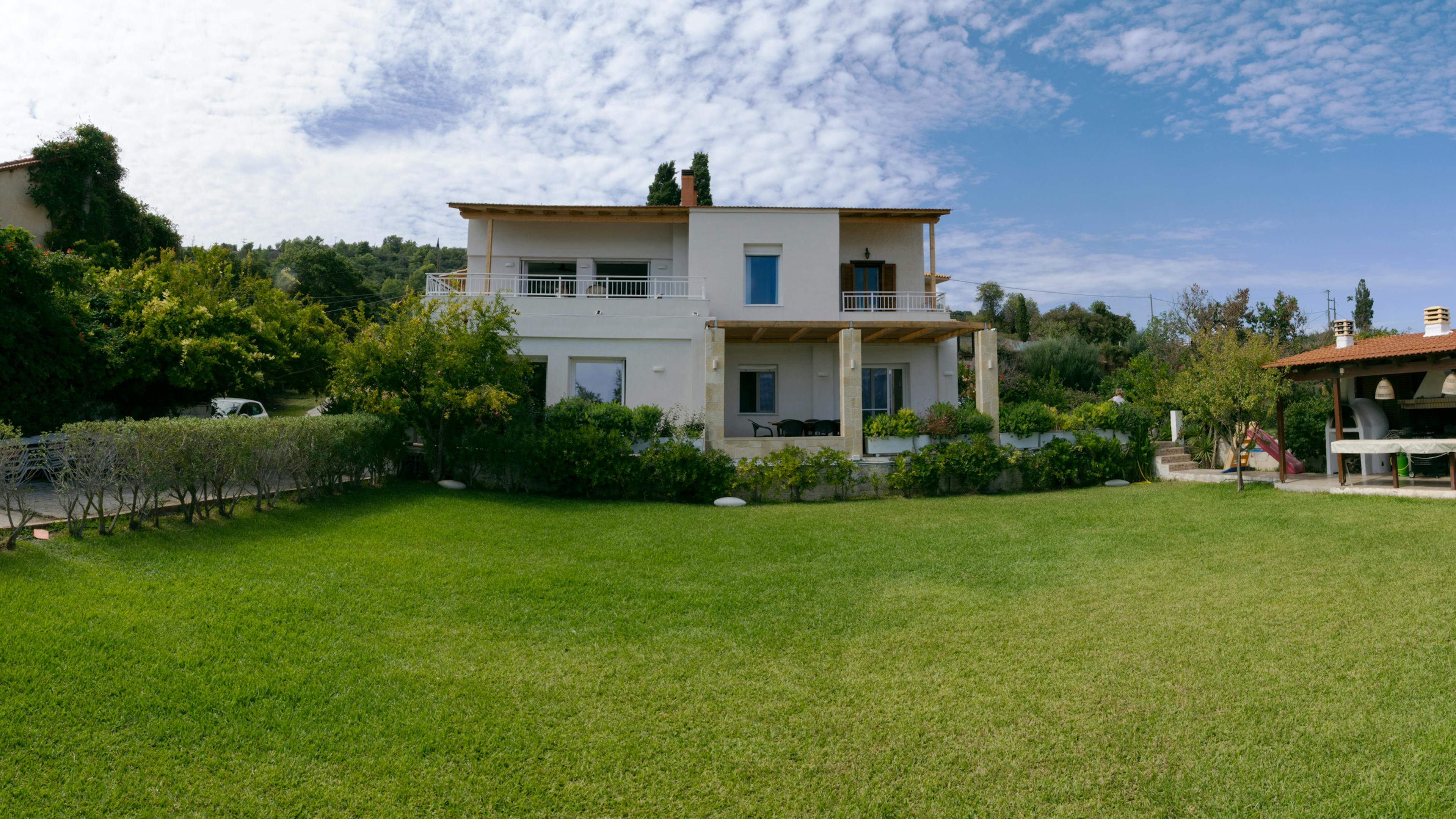 Morning practice on the terrace or garden — aerial sessions available.