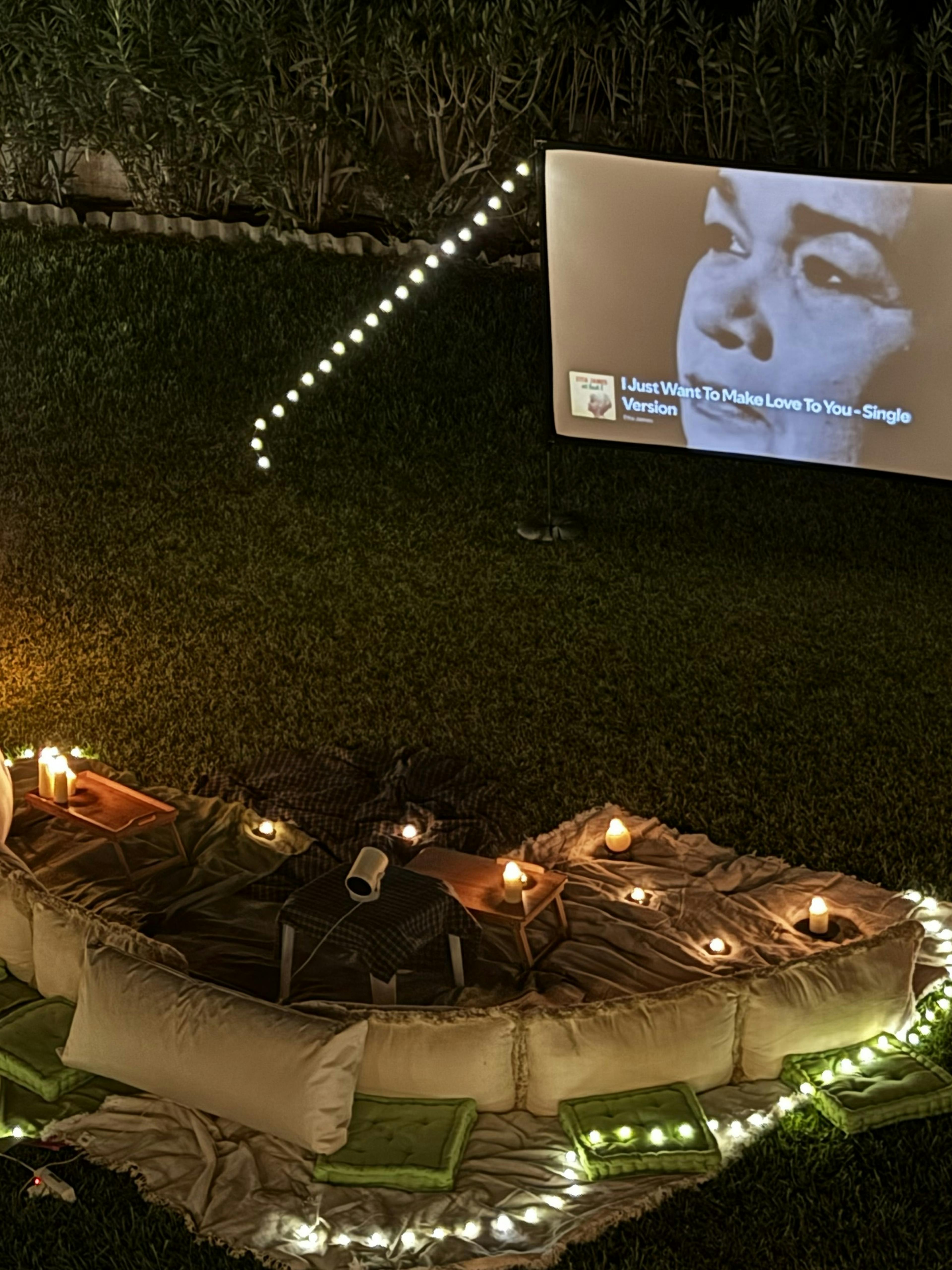 Outdoor movie screenings under the stars, with blankets, candles and the sound of waves.