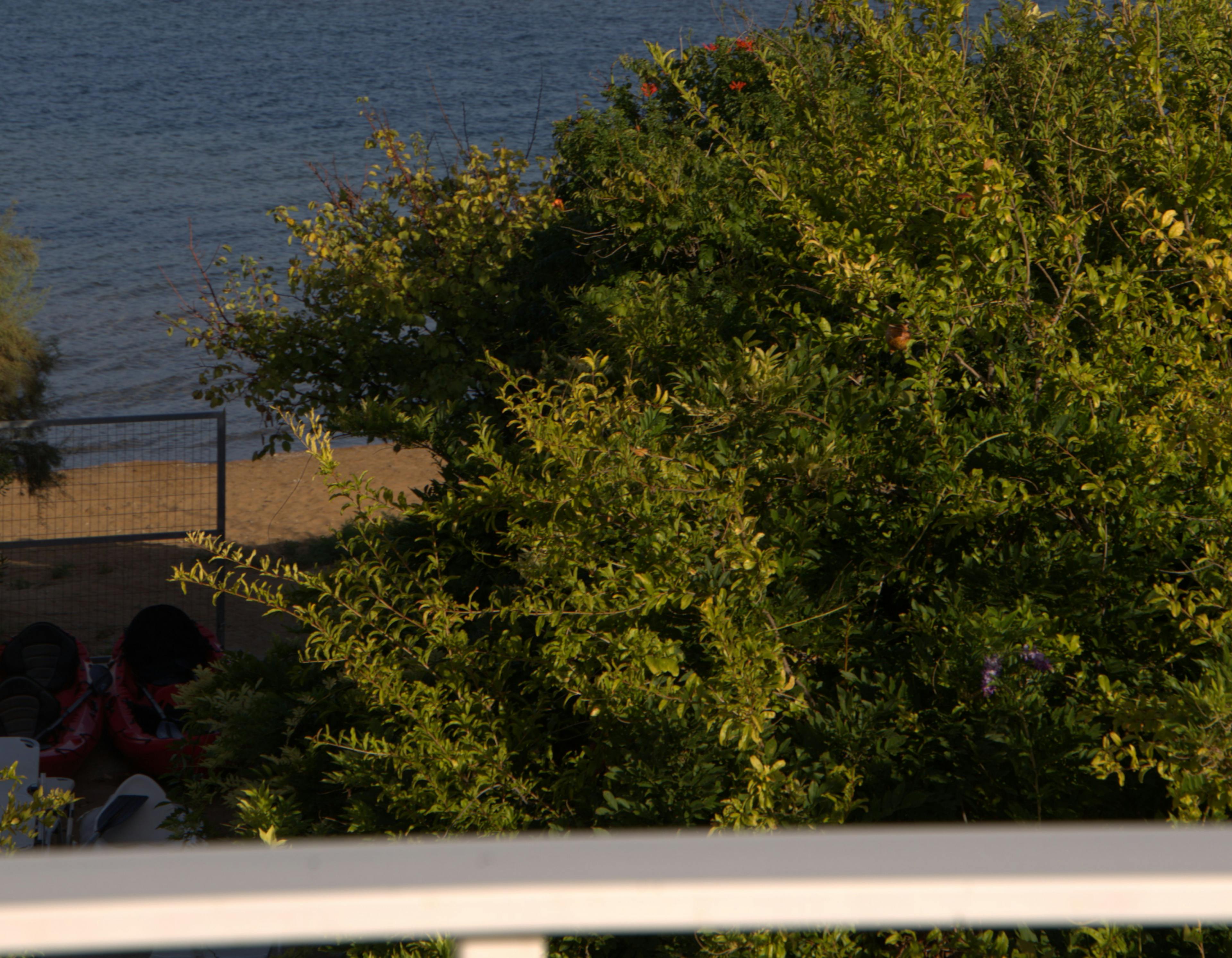 Semi-private sandy beach with direct access, canoe, and crystal-clear Ionian waters steps away.